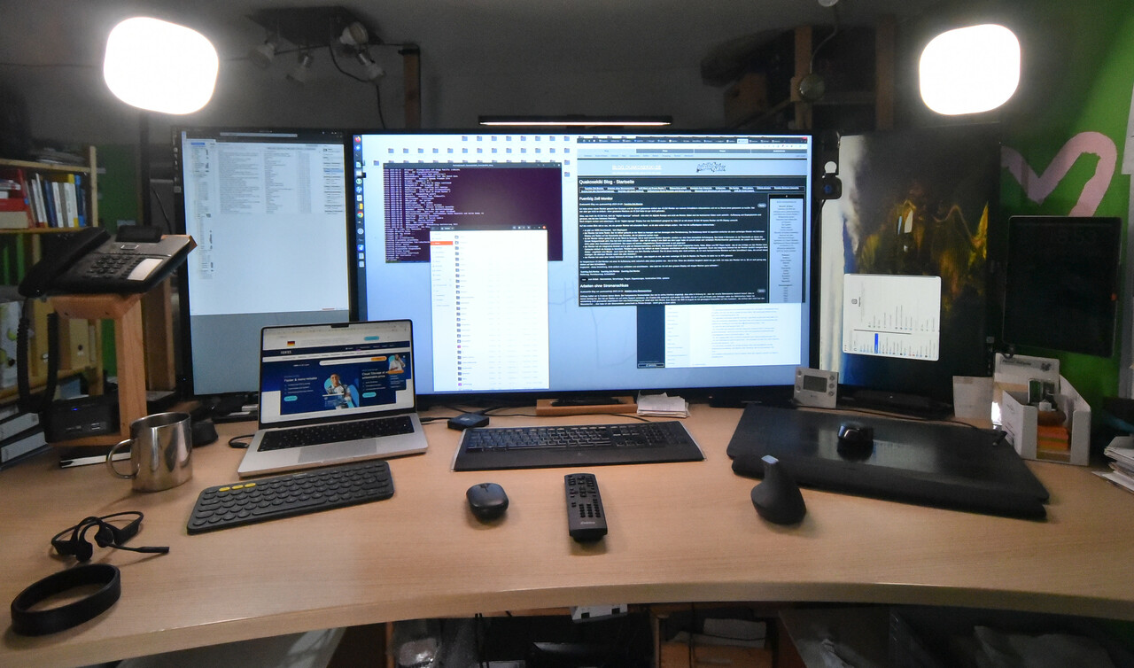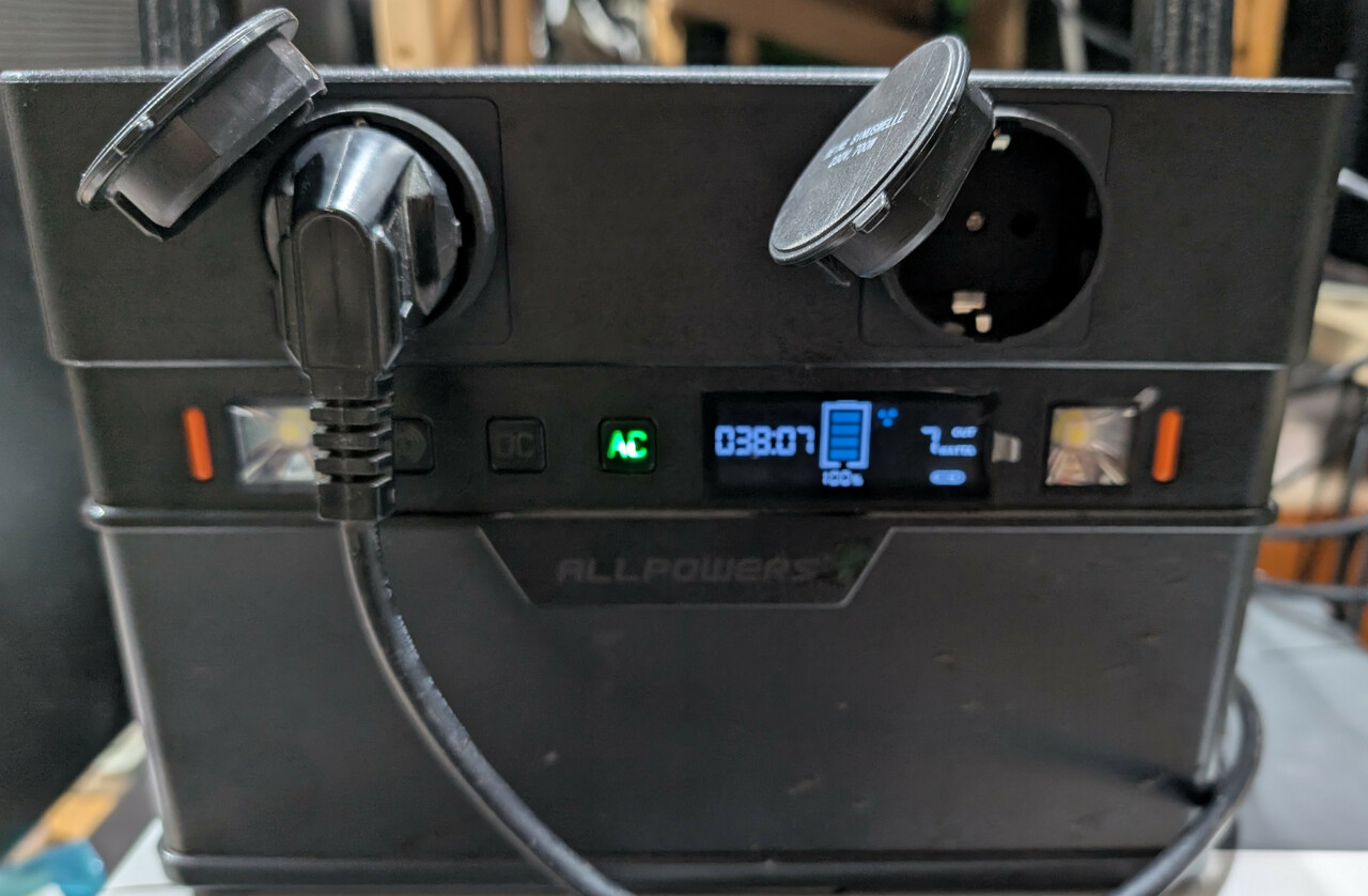 Mit Sonne oder einem modernen und sparsamen Monitor klappt es also auf jeden Fall ohne Stromanschluss zu arbeiten. Fuer das Setup braucht man dann noch ein Verlaengerungskabel - die Powerstation lueftet regelmassig, wenn der Wechselrichter an ist. Ich habe sie in den Nebenraum in einen Schrank gestellt oder nach draussen zum Solarpanel.