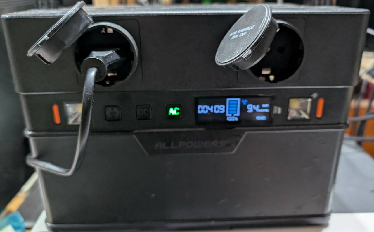 Fuer manche Arbeiten brauche ich aber einen grossen Monitor - das ist dann schon nicht mehr so einfach. Mit USB Anschluss oder Akku habe ich weder grosse noch hochaufloesende Bildschirme gefunden. Wenn ich draussen arbeite habe ich manchmal einen 14 Zoll USB Monitor benutzt - das ist aber vom Komfort lange nicht zu vergleichen mit einem grossen 4k Monitor ! Fuer mehr Bildschirmflaeche brauche ich also 220V fuer den Monitor. Dafuer habe ich meine 600Wh AllPowers Powerstation aus dem Dachzeltanhaenger benutzt.